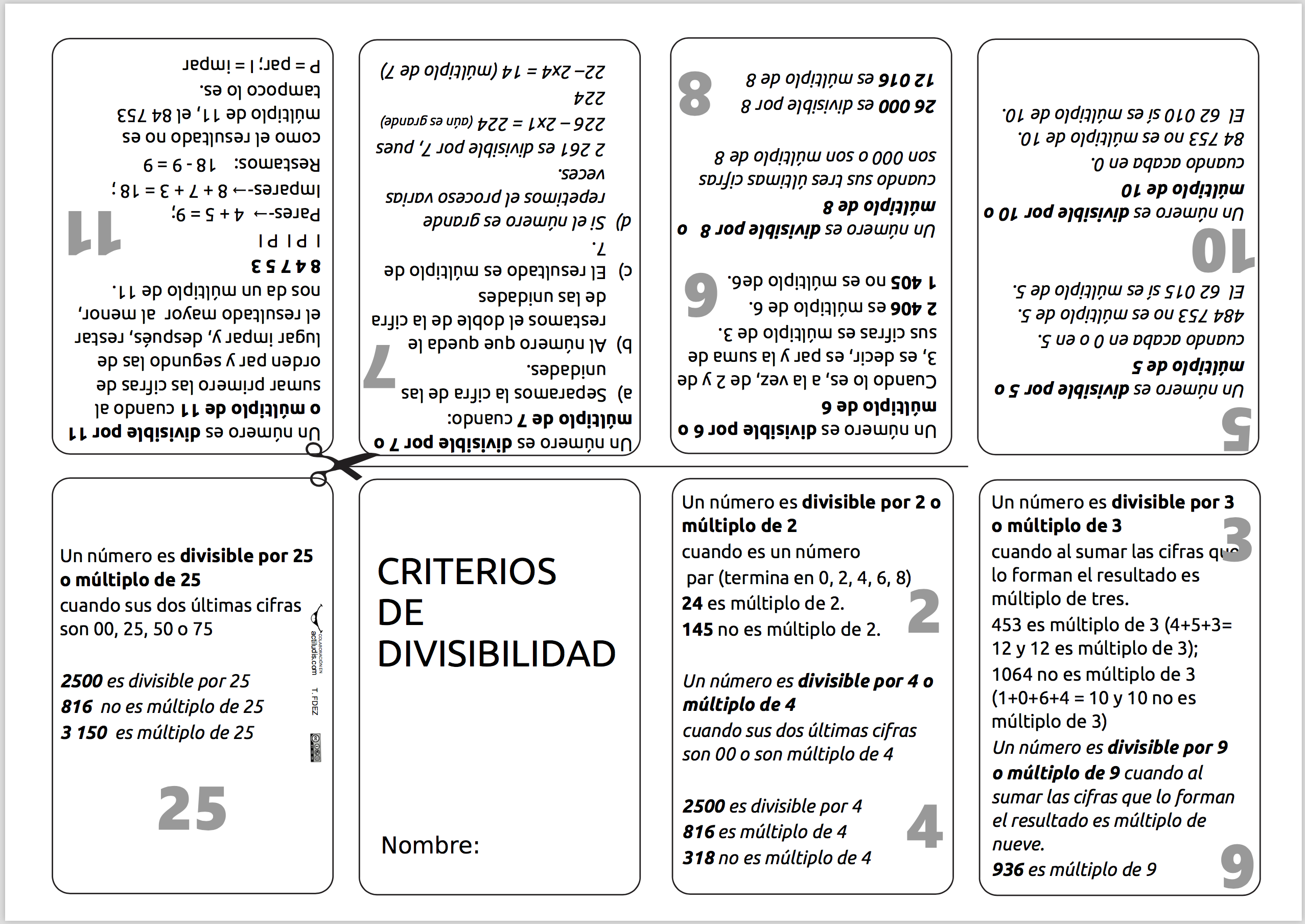 Tomás Fernández García maestro en el «CEIP Ausiàs March» de Alicante , autor de los blog «El blog de Tomás» y «El cuerpo de barro«, nos remite un mini libro en el que se plasman y resumen los criterios de divisibilidad.