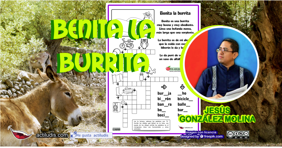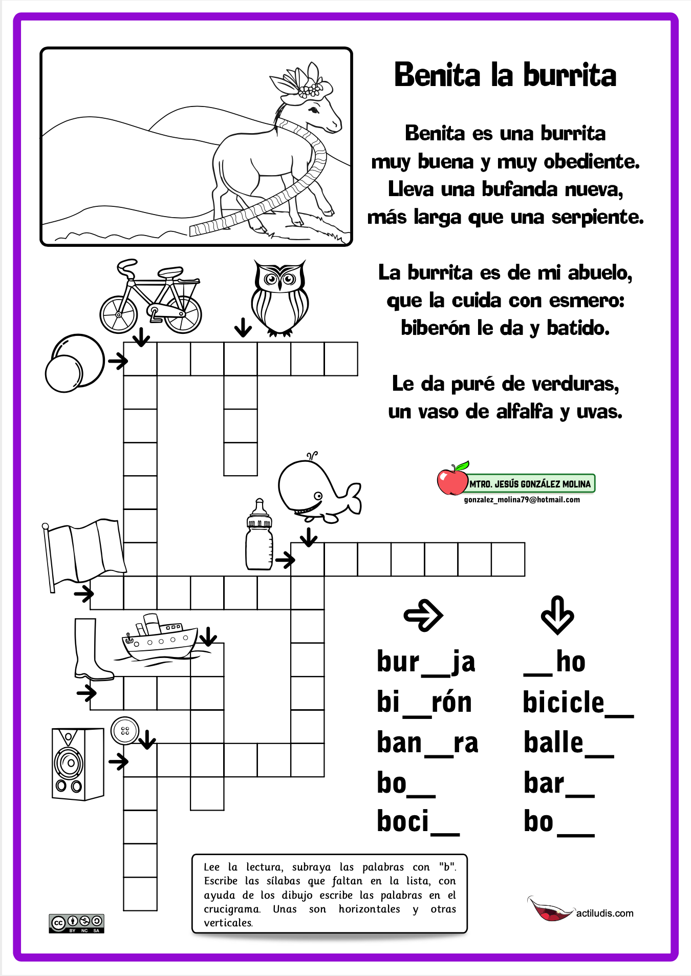 Repasamos la lectura y reconocimiento de la legra «b» con una poesía con «Benita la burrita» y un crucigrama en el cual para reforzar el aprendizaje y facilitar al pequeño alumnado la realización de las palabra cuyo dibujo aparece en el crucigrama, se han quitado sólo la sílaba con la letra «b».