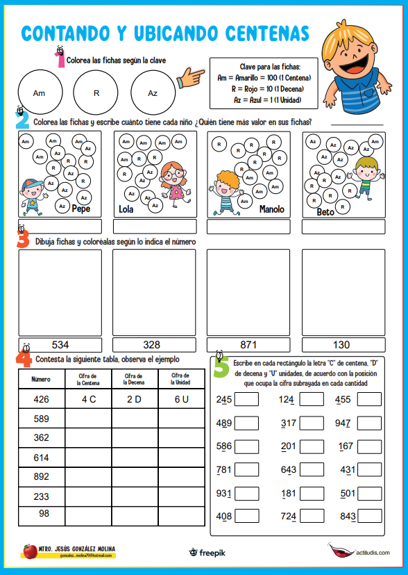 El maestro Jesús González Molina nos comparte un nuevo material para trabajar en las aulas. En esta nueva ficha de trabajo se presentan varias actividades centradas en el trabajo con las centenas y los órdenes de magnitud.