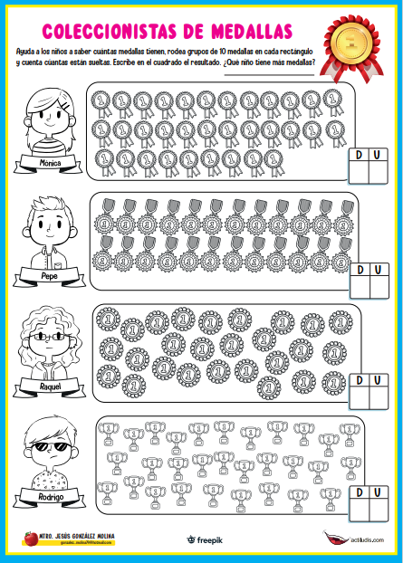 El maestro Jesús González Molina nos comparte un nuevo material para trabajar en las aulas. En esta nueva ficha aparecen varios personajes con una serie de medallas; para descubrir cuál de ellos tiene más tendremos que contarlas todas, ayudándonos de la decena para formar varios agrupamientos.