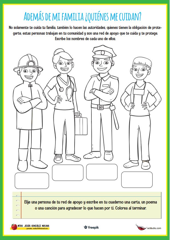 Esta actividad se centra en la producción escrita. Nos propone escribir un breve texto (carta, poema…) dedicado a las personas que trabajan para protegernos; como bomberos, médicos, enfermeros o policías.
