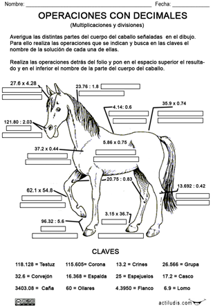 La actividad cosiste en descubrir y nombrar las partes de la anatomía de un caballo realizando operaciones de multiplicar y dividir con decimales en los dos factores.