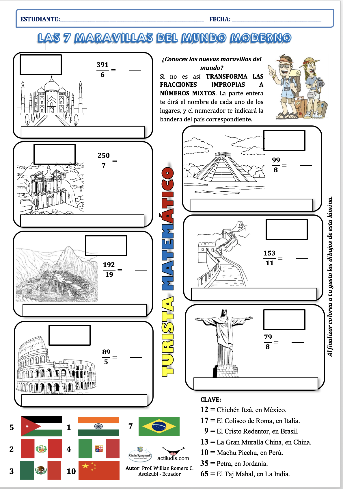 Willian Romero Casalliglla (enlace al facebook), maestro de aula de la Escuela de Educación Básica «Ciudad Guayaquil», de la parroquia Ascázubi, perteneciente al cantón Cayambe, provincia de Pichincha en Ecuador, nos remite una actividad destinada para el alumnado de sexto año de básica (quinto grado), para que puedan repasar la transformación de fracciones impropias a números mixtos.