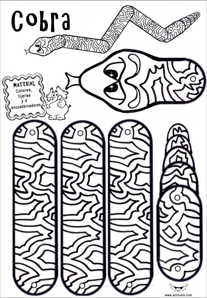 Manualidad para recortar y montar una serpiente con movilidad. Para ello sólo necesitas descargar la fichas, colores para darle el aspecto más peligro que creas oportuno, una tijeras para recortar las distintas piezas y cuatro encuadernadores para ensamblar las piezas móviles.