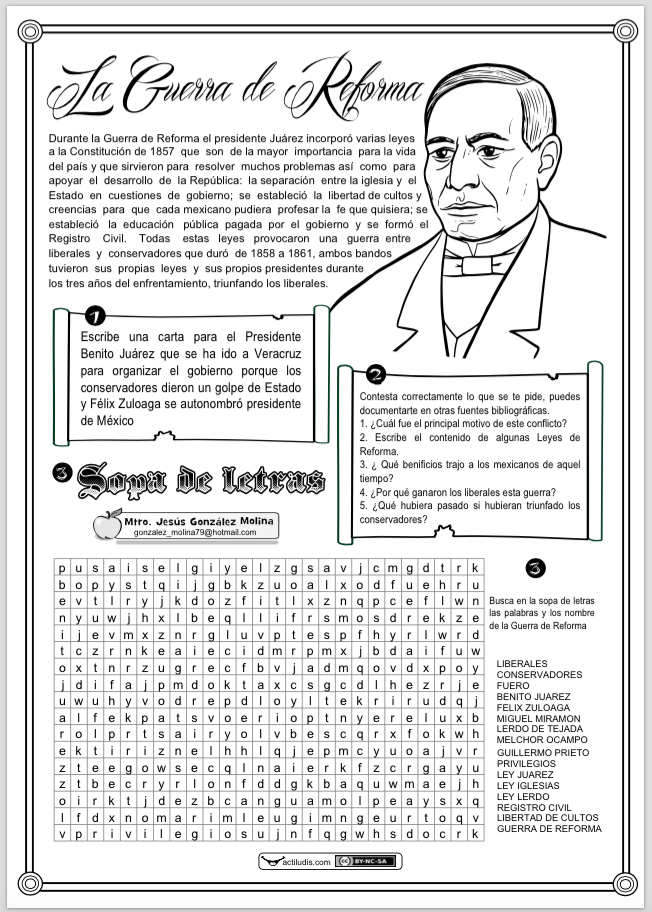 A través de una sopa de letras en la que deben buscar palabras relacionadas con los hechos ocurridos durante la guerra de Reforma y sus protagonistas, en la que el presidente Juárez incorporó varias leyes a la Constitución de 1857 que son de la mayor importancia para la vida del país y que sirvieron para resolver muchos problemas así como para apoyar el desarrollo de la República, el profesor Jesús González Molina de la Escuela Primaria Vicente Guerrero, desde Los Placeres del Oro, Guerrero, México lleva a al alumnado a trabajar una página de la historia de México.