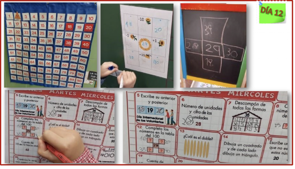 Día 12: hay que completar en la tabla del 100 los números que corresponden a las diagonales del 29. Incuye vídeo de cómo lo trabajan en casa.