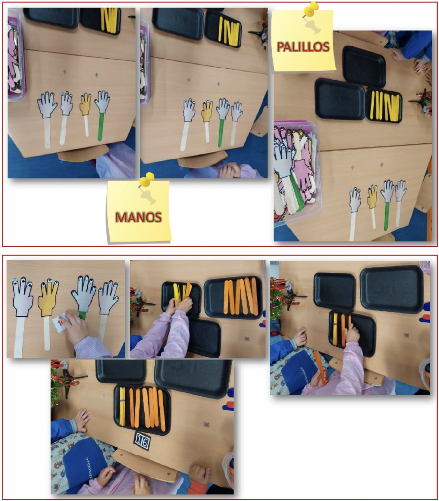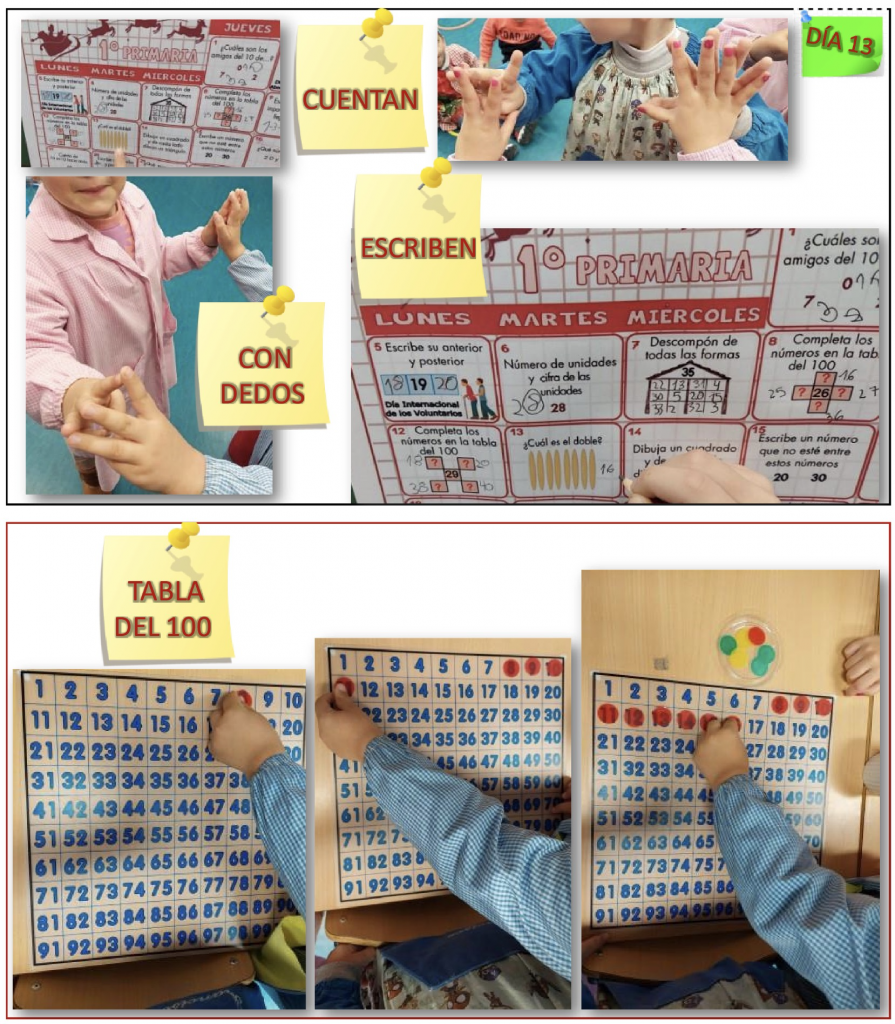 Día 13: hay que construir y calcular el doble de ocho. Al encontrarnos en infantil de 5 años alargamos el proceso con diferentes estrategias en función de la diversidad del grupo contando, haciéndolo con los dedos de sus manos en parejas, con las marionetas de manos, en la tabla del 100 y con palillos.