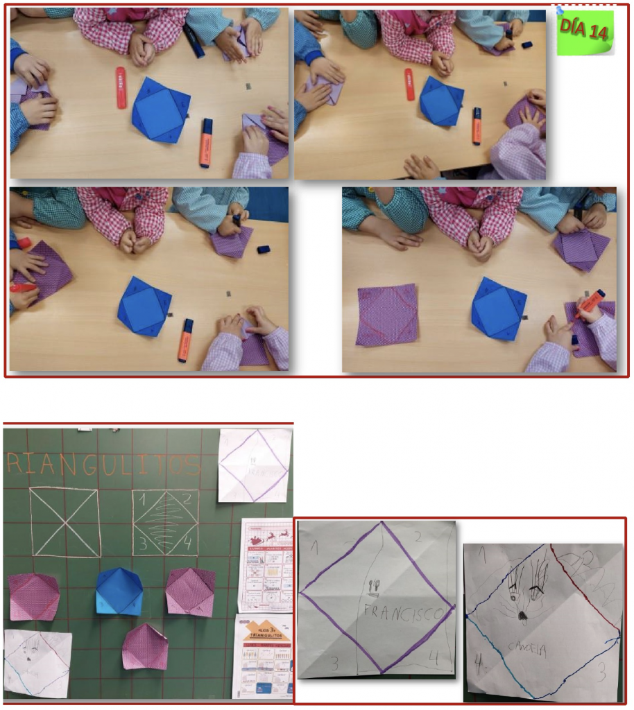 Día 14: UN AUTÉNTICO RETO QUE SE HA INICIADO DE FORMA MUY SENCILLA. Si hay que dibujar un cuadrado y de cada uno de sus lados, un triángulo, sólo ha sido posible porque estamos metidos de lleno con el cuento de los tres triangulitos y el rombo feroz. Lo más sencillo en 5 años es partir del doblado de papel para después intentar hacer el dibujo.