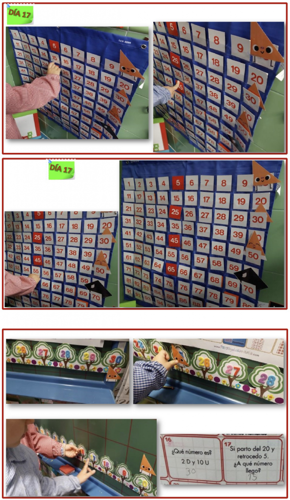 Día 17: “si parto de 20 y retrocedo 5. ¿A qué número llego?”. Hemos partido en la tabla del 100 de diferentes números donde se encontraban los personajes del cuento que estamos disfrutando día a día y en la recta numérica con diferentes tramos comenzando por 30. Se trata de no hacer una actividad puntual, la finalidad que vayan adquiriendo el patrón del cinco de forma descendente y partiendo de números formados por decenas exactas.