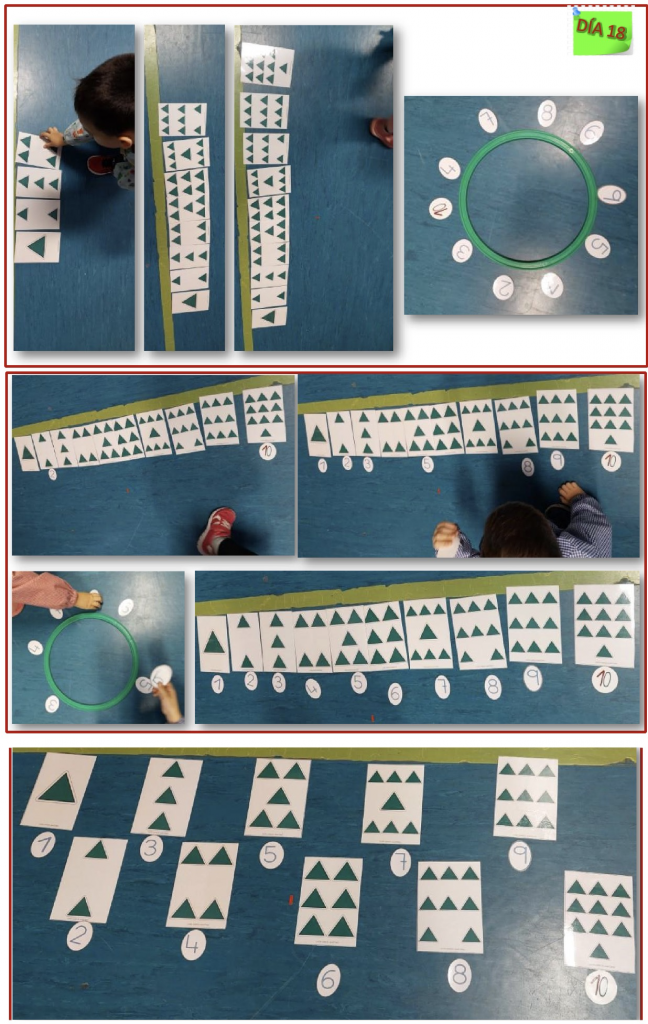 Día 18: “escribe un número par que se encuentre entre el 3 y el 7”. Claramente. Las opciones son cuatro o seis. Lo que ocurre en la etapa de E.I. es que tenemos que partir de las bases del sentido numérico para llegar a estos niveles de abstracción; es por ello, que he considerado oportuno partir de actividades que implicarán al alumnado de 4 y 5 años. La secuencia ha sido la siguiente: