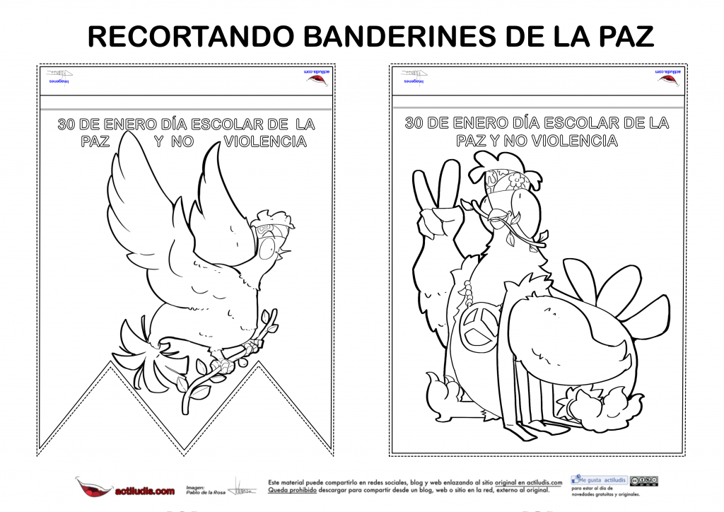 En esta actividad, aprovechando el «Día Escolar de la Paz y No Violencia» trabajamos la psicomotricidad de una forma divertidad a través del recortable banderines para montar o decorar pasillos o aulas del colegio. En total se trata de 8 modelos de banderines distintos, con líneas punteadas alrededor, y cuyas imágenes mostramos al final de este artículo.