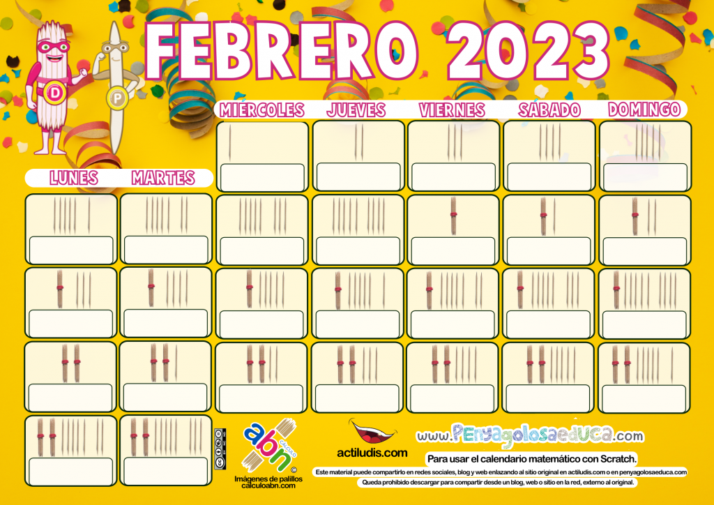 Calendario con representación de los días del mes de FEBRERO con palillos. Este material está pensado para Educación Infantil y Primero de Primaria con el que trabajar el calendario. La idea es que el alumnado use el calendario como rutina identificando el día e identificando el número que corresponde con los palillos representados.