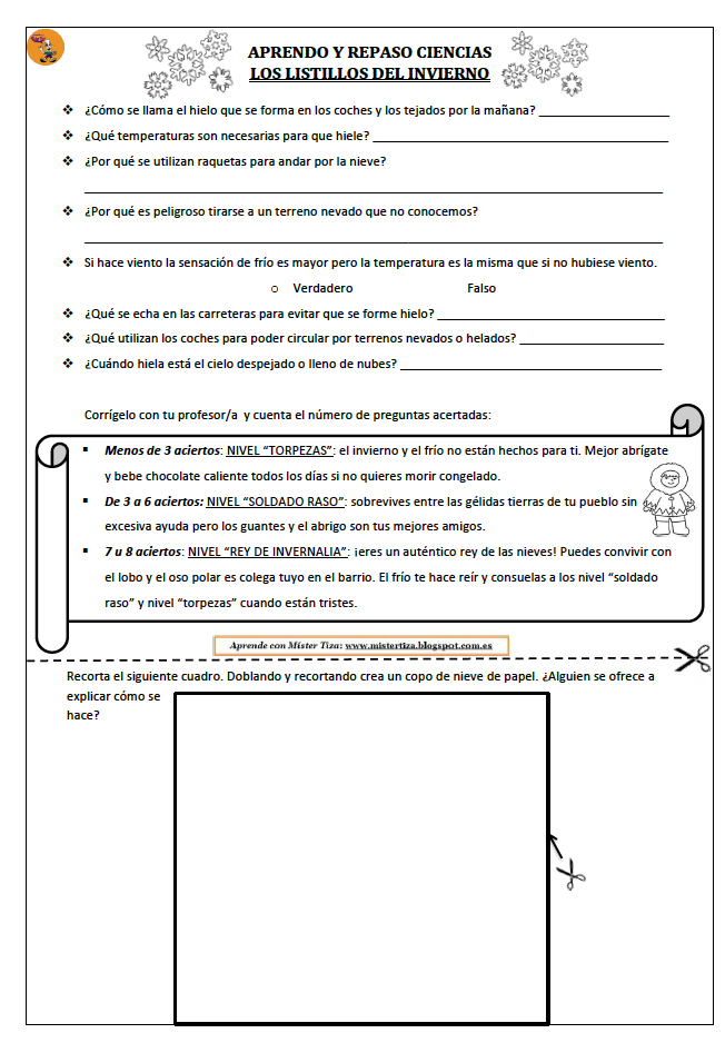 Mario San Bernardino Martín del CEIP Gloria Fuertes, en Meco (Madrid) y autor del blog «Aprende con Míster Tiza» nos remite una divertida ficha con datos e información relacionados con los fenómenos más característicos del invierno. Es ideal para «calentar motores» tras la vuelta de las vacaciones navideñas.Está pensada para el alumnado de 4º a 6º de Primaria.