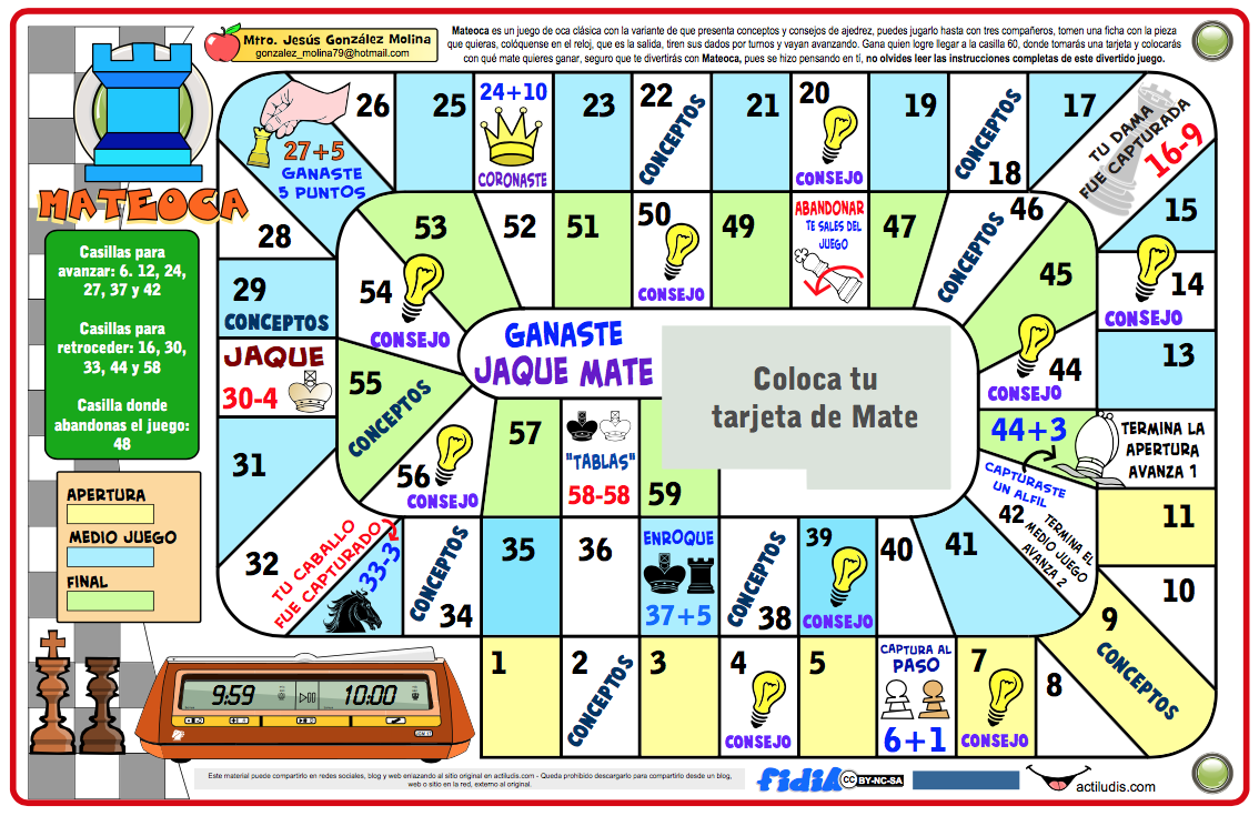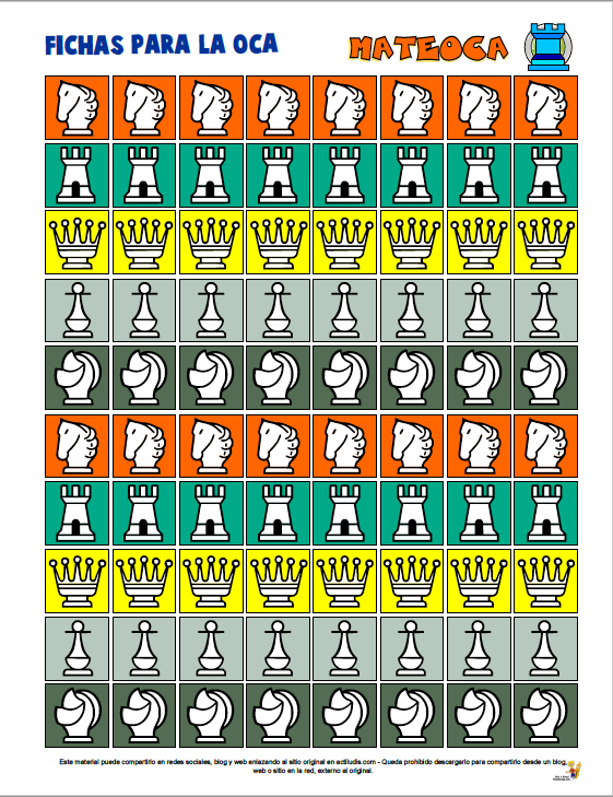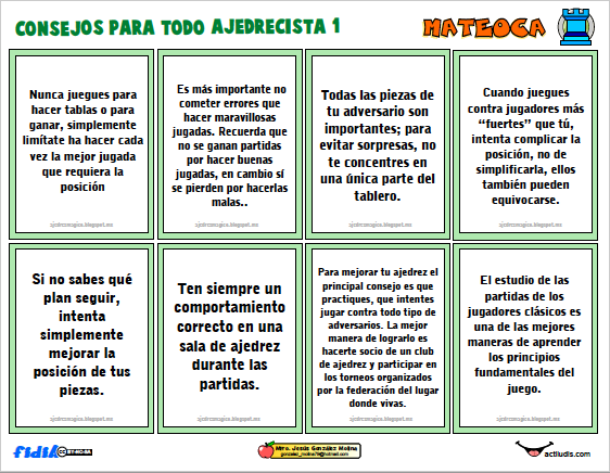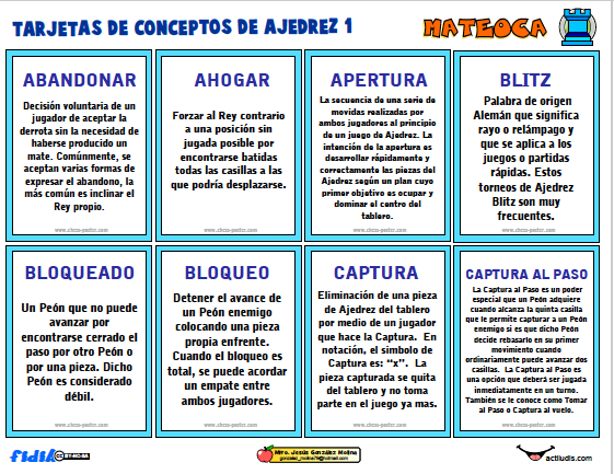 En el fichero además de las instrucciones encontrará fichas con las piezas del ajedrez, tarjetas de mates tarjetas de “consejos” y “conceptos” para ir aprendiendo más sobre ajedrez,