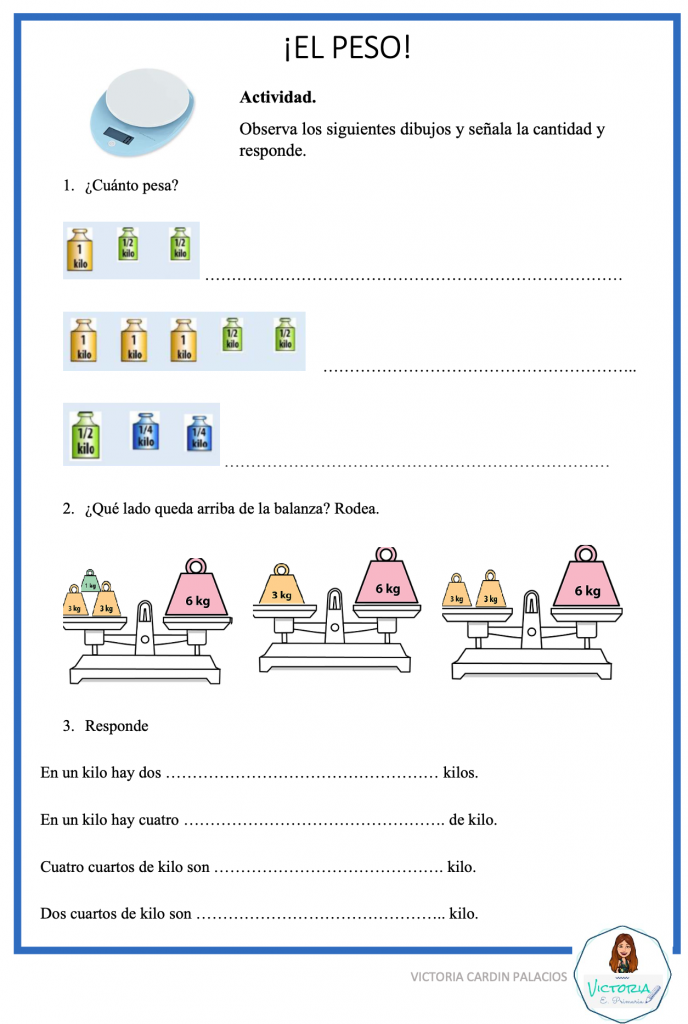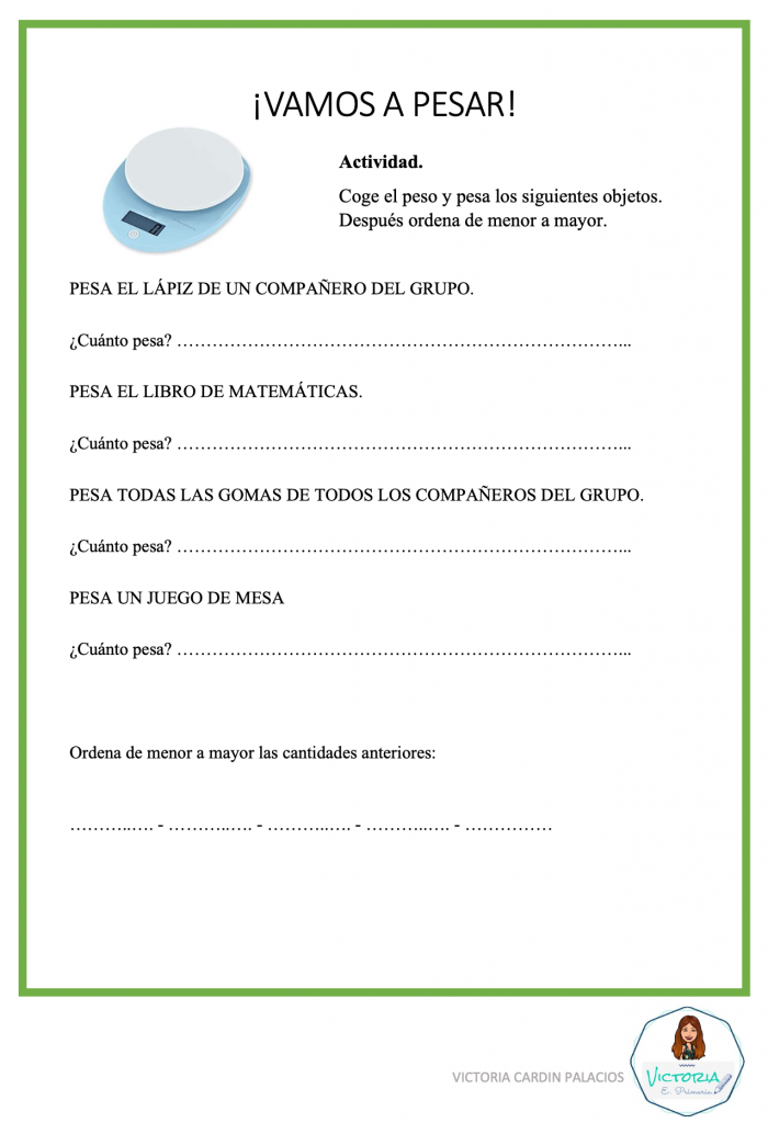 La segunda es una actividad de conversión de unidades de masa que ya titulado «El Peso» al resultar más familiar esta denominación al alumnado.