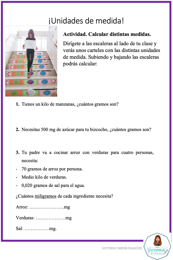 En el primero hace referencia a la existencia de unas escaleras, en el colegio, con unidades de medida, con las que subir y bajar para calcular la propuesta de actividades que nos ofrece. Si no dispones de este recurso didáctico, ya tienes una idea más, pero mientras tanto usa la conversión habitual.