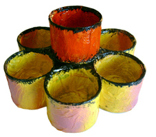 Latas (una de distinta forma e igual tamaño al resto), papel de periódico, papel de cocina, témpera líquida, pegamento de contacto, cola, agua, brocha, y barniz cerámico o similar.