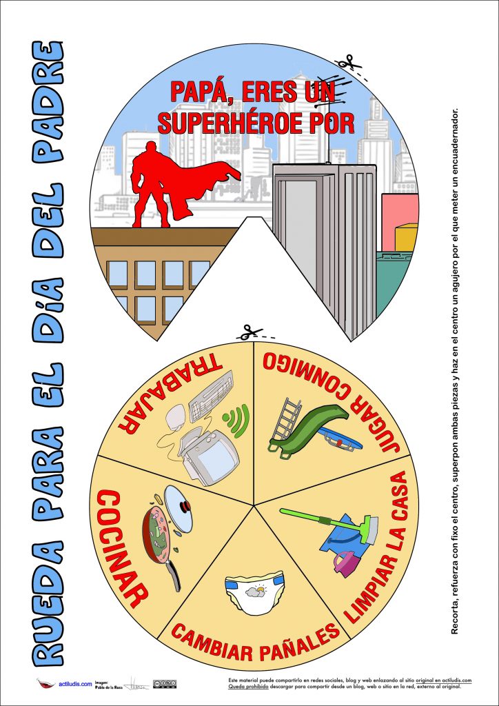 Hemos realizado una rueda para el día del padre el lema: «Papá, eres un superhéroe por…» . Se trata de recortar ambas ruedas y poner la que tiene la ventana sobre la que muestra las diferentes opcines. Se recomienda colocar una sobre la otra antes de hacer el agujero por el que pasar el encuadernador, así como reformar dicha zona con fixo.