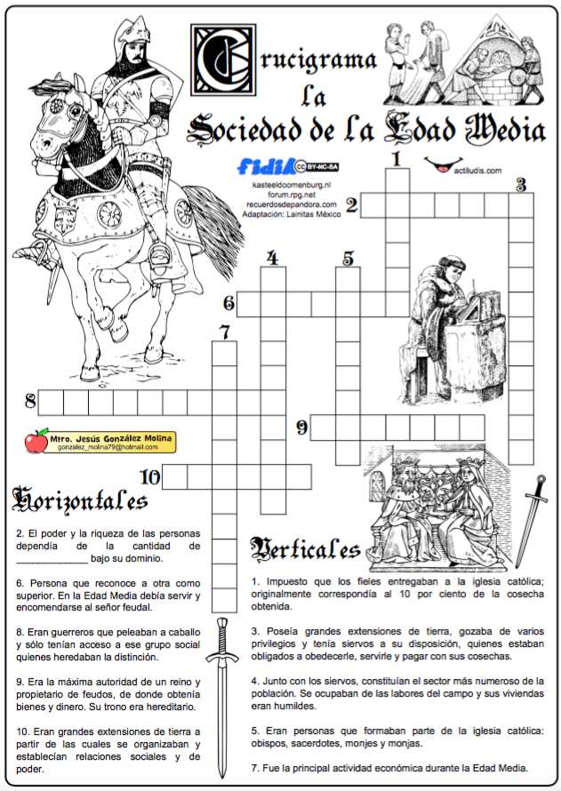 El profesor Jesús González Molina de la Escuela Primaria Vicente Guerrero y catedrático en el nivel de posgrados, desde Los Placeres del Oro, en el estado de Guerrero, México, nos envía una actividad en la que mediante un crucigrama se trabajan los términos más usuales en el sociedad de la Edad Media.