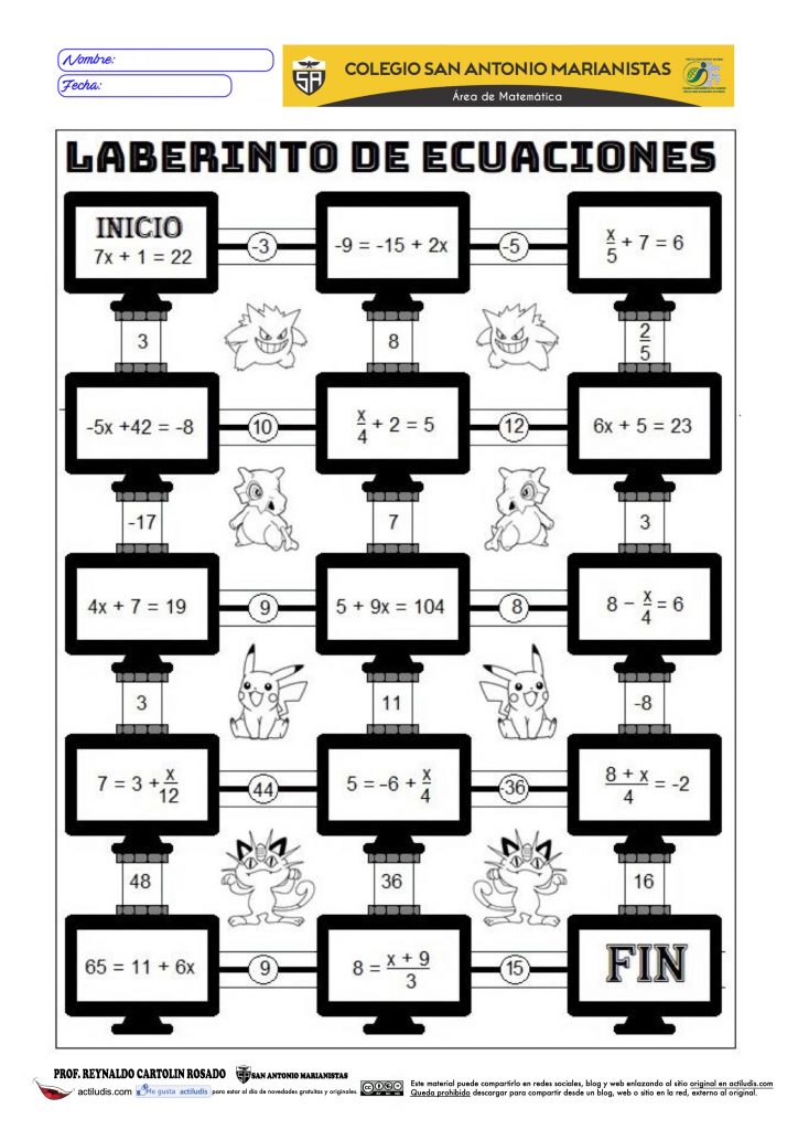 La actividad consite en un laberinto, acompañado por personajes de Pokemon, cuyo camino nos lo van trazando las soluciones de cada una de las ecuaciones.