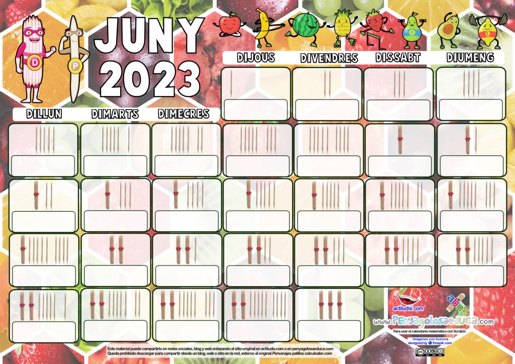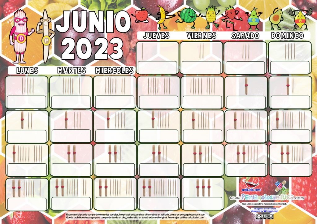 Calendario matemático de palillos para JUNIO de 2023