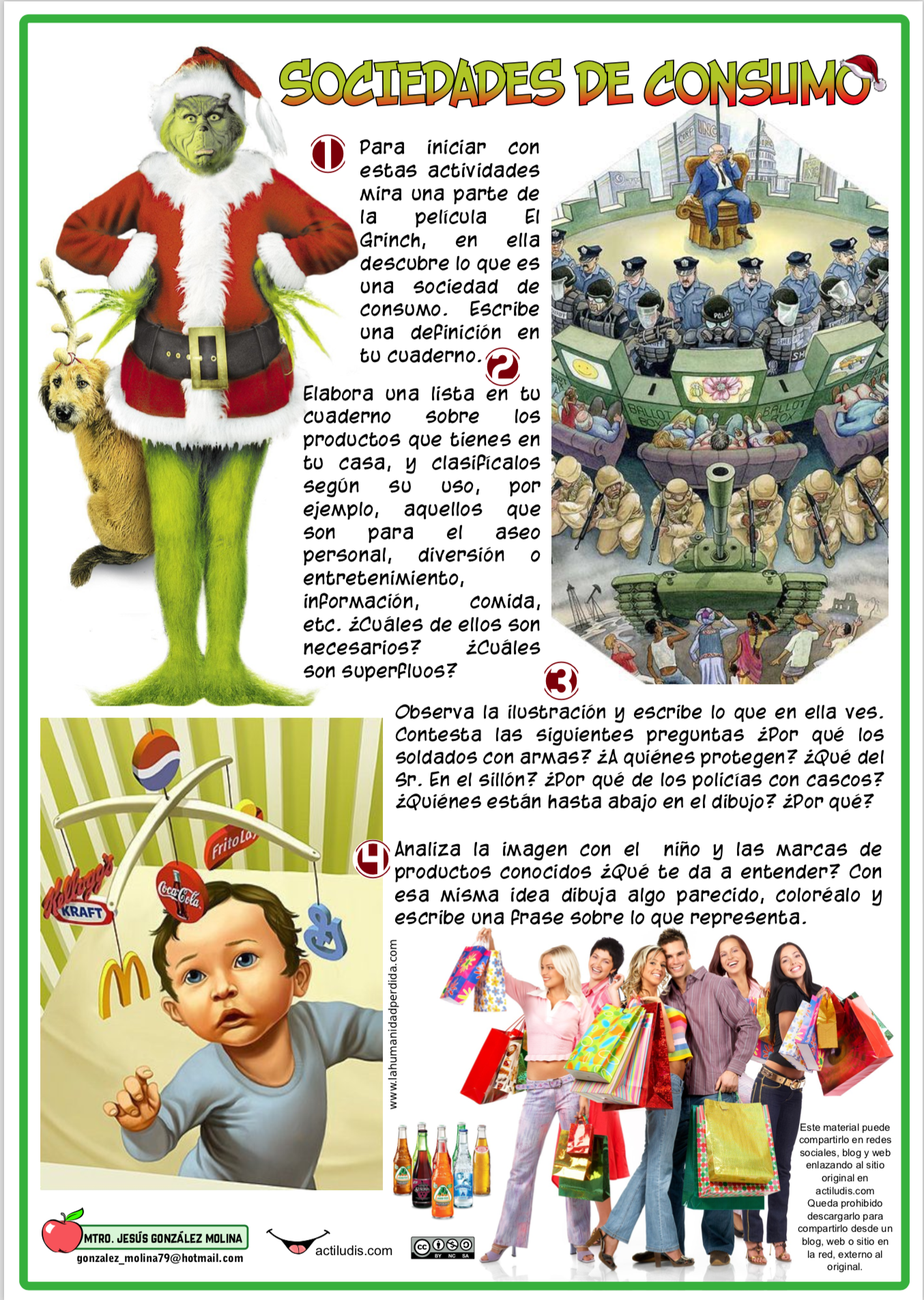 Esta actividad, realizada por el profesor Jesús González Molina de la Escuela Primaria Vicente Guerrero y catedrático en el nivel de posgrados, desde Los Placeres del Oro, en el estado de Guerrero, México, consiste en varias preguntas en las que el alumnado deber realizar una serie de acciones encaminadas a llevarlo a la reflexión sobre qué es necesario y qué no, conocer la sociedad de consumo y descubrir los hilos que se manejan para que sin darte cuenta caigas fácilmente en las redes consumistas.