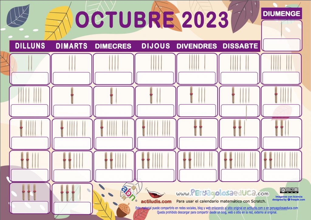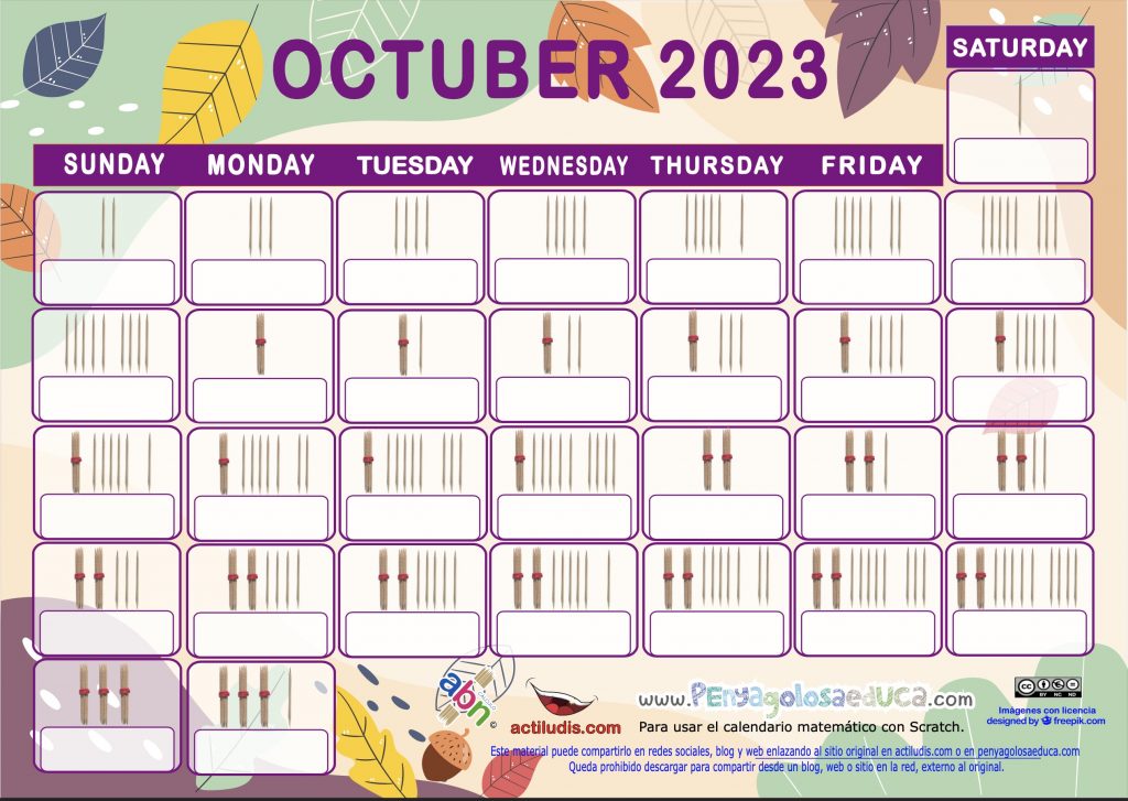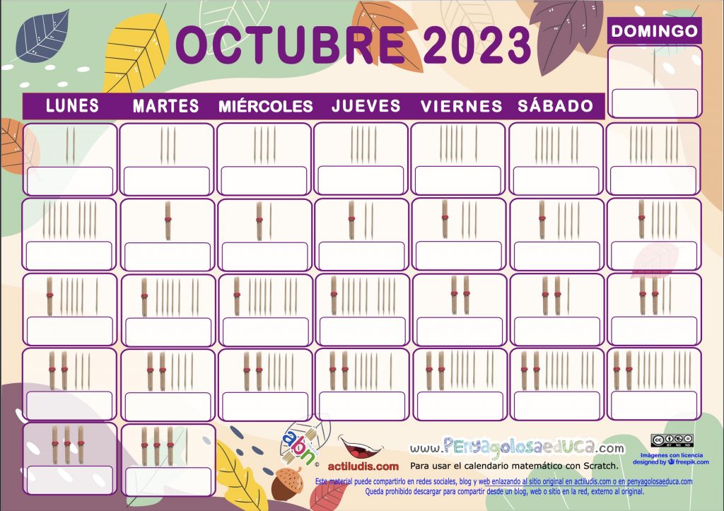 Calendario con representación de los días del mes de OCTUBRE con palillos. Este material está pensado para Educación Infantil y Primero de Primaria con el que trabajar el calendario. La idea es que el alumnado use el calendario como rutina identificando el día e identificando el número que corresponde con los palillos representados.