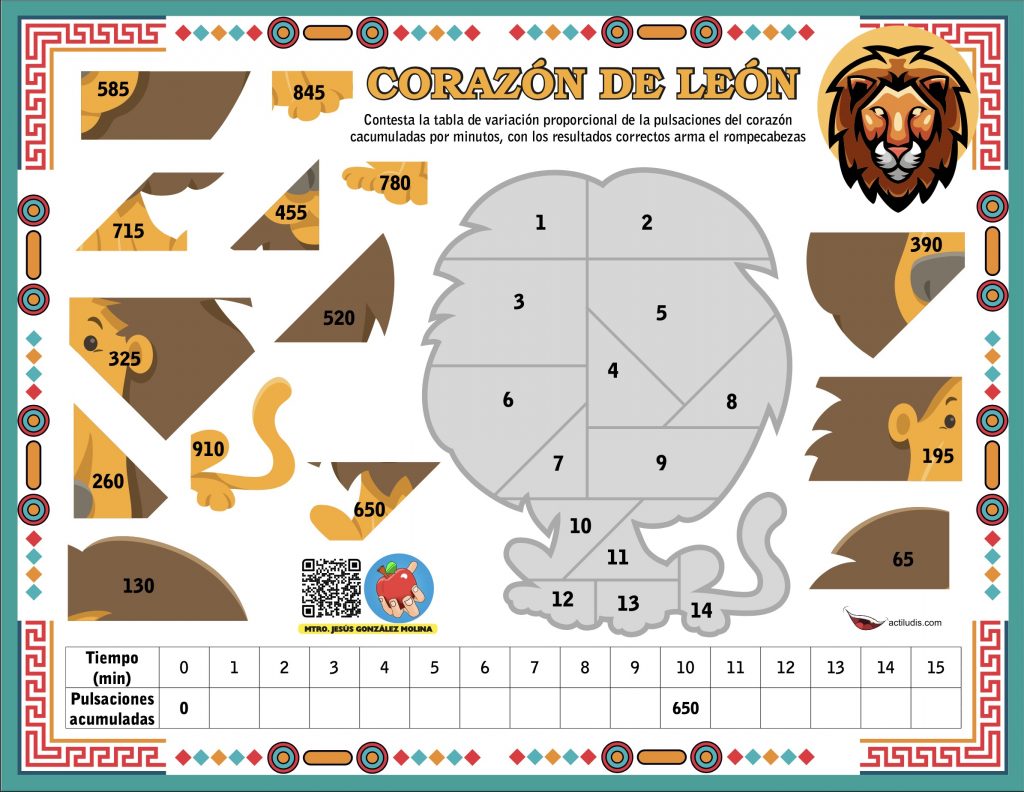 Con estas actividad llamada «Corazón del león» trabajamos la proporcionalidad de los latidos del corazón de un león. Paar ello empezamos con el datos que conocemos y que según indica en 10 minutos el león tienen 650 pulsacciones.