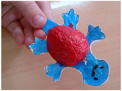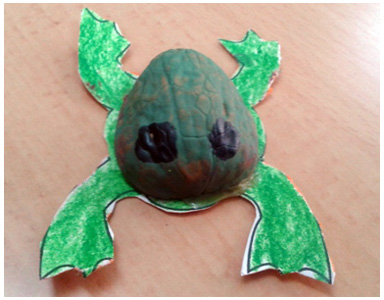 Necesitamos unas cáscaras de nueces, pintura de dedos, cola de carpintero y la ficha con la plantilla de la rana y la tortuga.