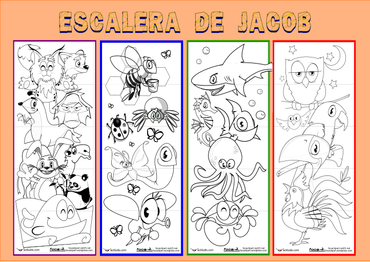 Basado en ese juego he creado unas plantillas para trabajar en la clase de educación artística este juego. Se trata de cuatro plantillas de cinco piezas de 5 x 10 cm cada una, con la temática de animales mamíferos, insectos, aves y peces que una vez coloreadas, recortaremos y pegaremos en las piezas de cartón que forman la escalera de Jacob.