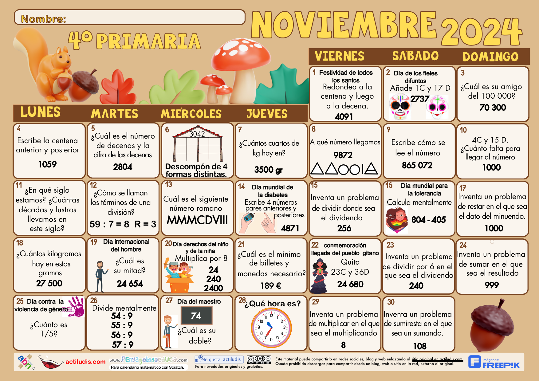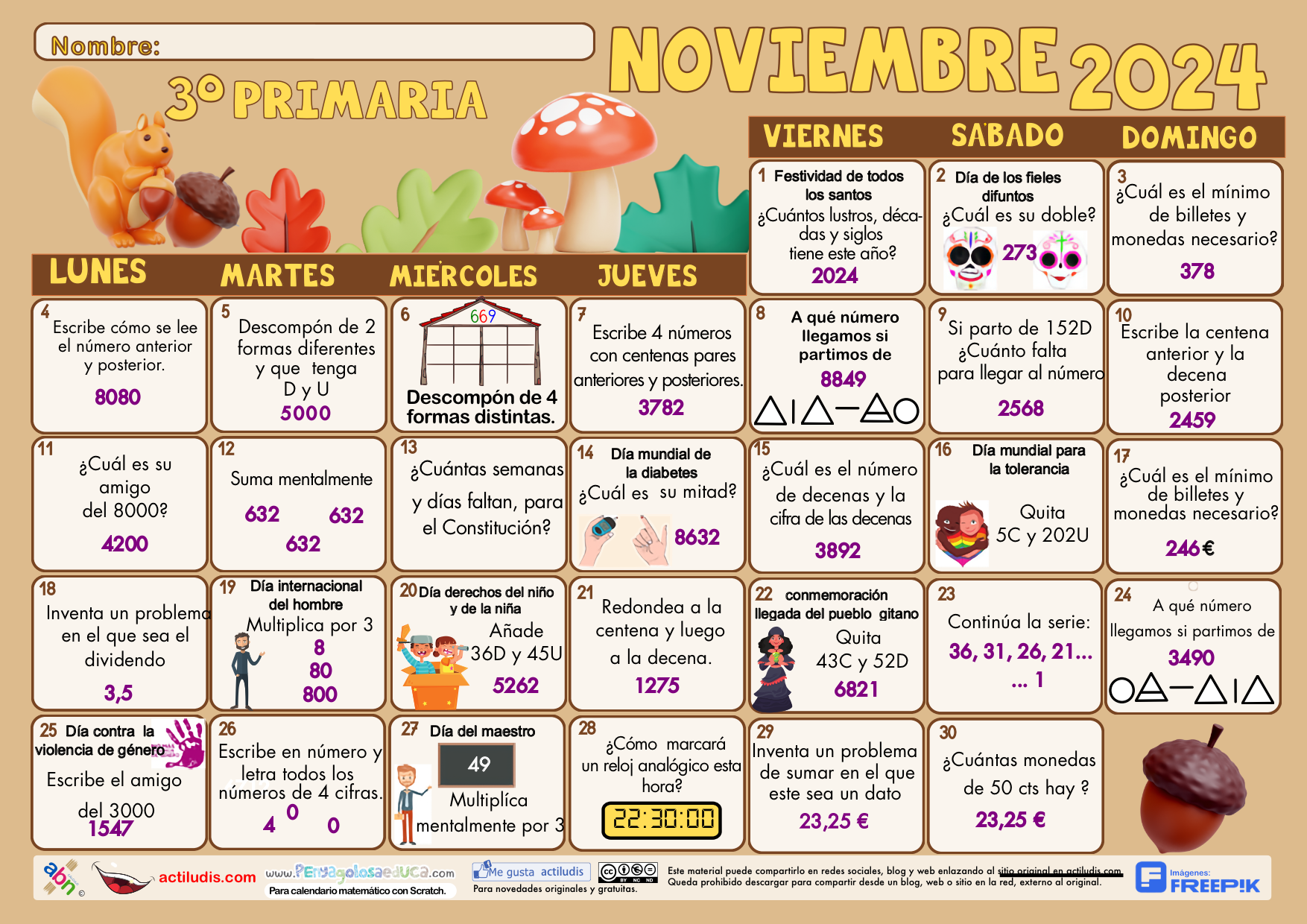 Calendario matemático para el SEGUNDO CICLO de Primaria. NOVIEMBRE 2024
