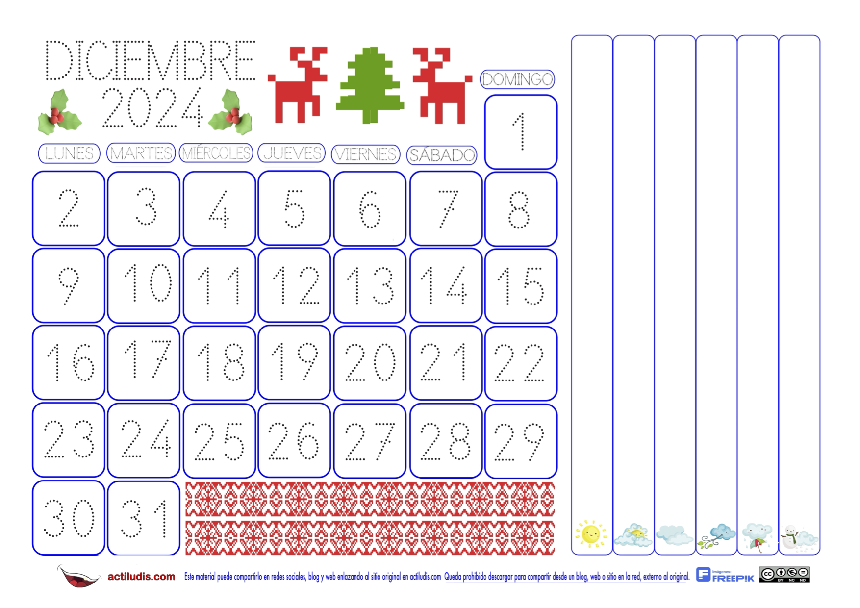 Calendario punteado de DICIEMBRE 2024 para escritura numérica