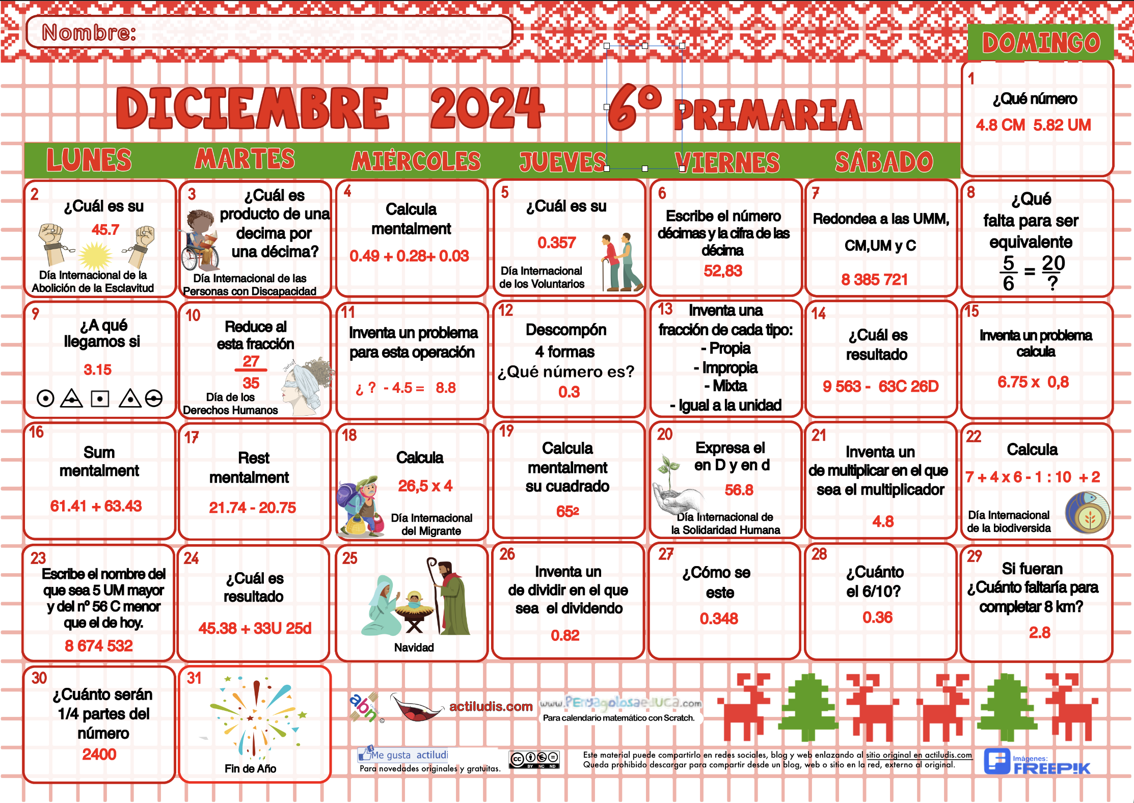 Calendario matemático para el TERCER CICLO de Primaria. DICIEMBRE 2024