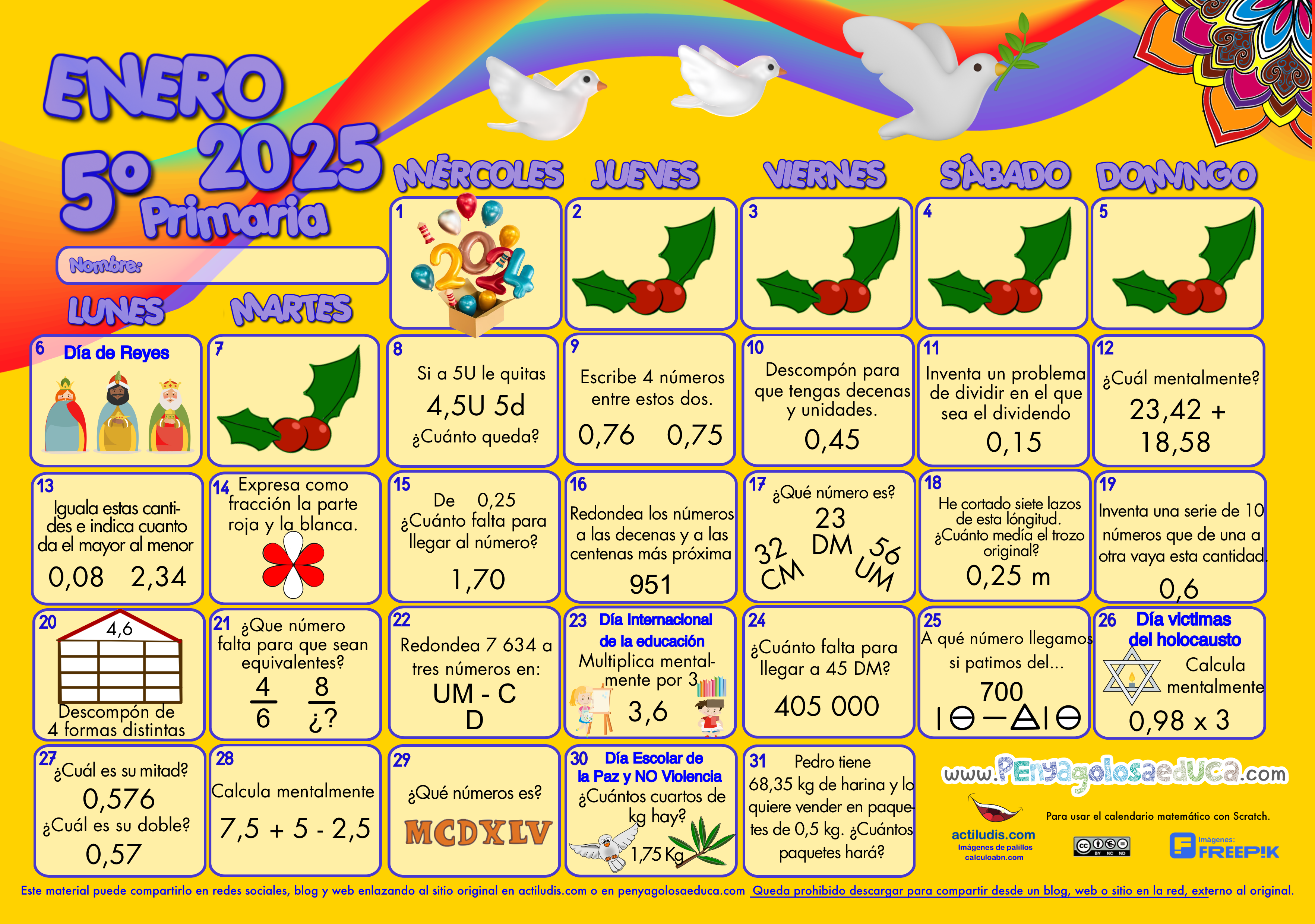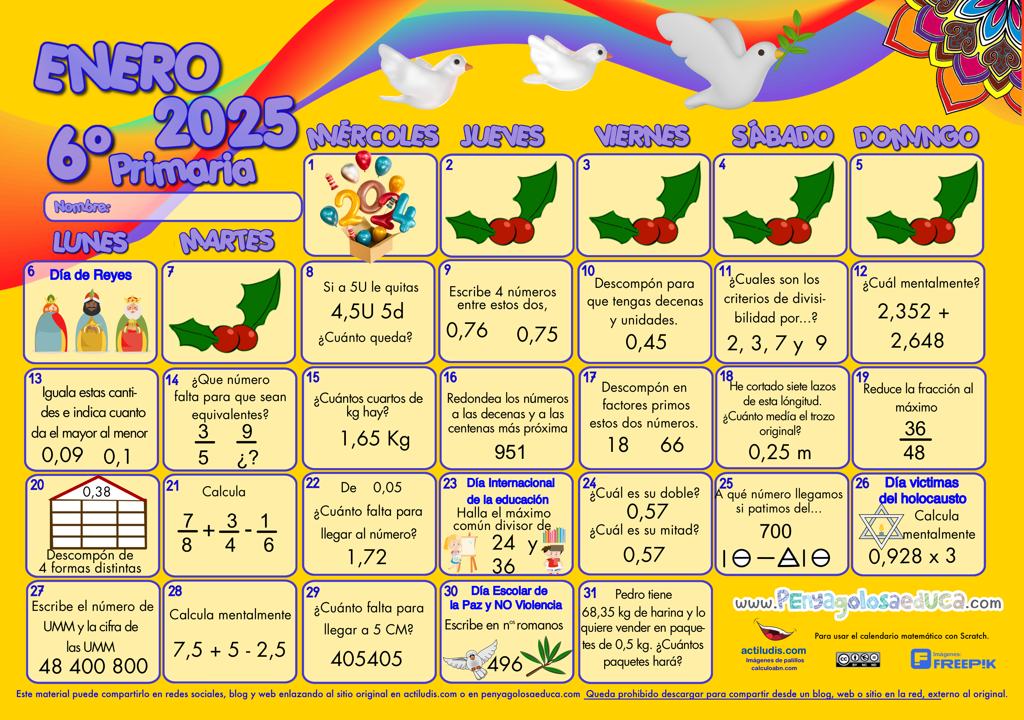 Calendario matemático para el TERCER CICLO de Primaria. ENERO 2025