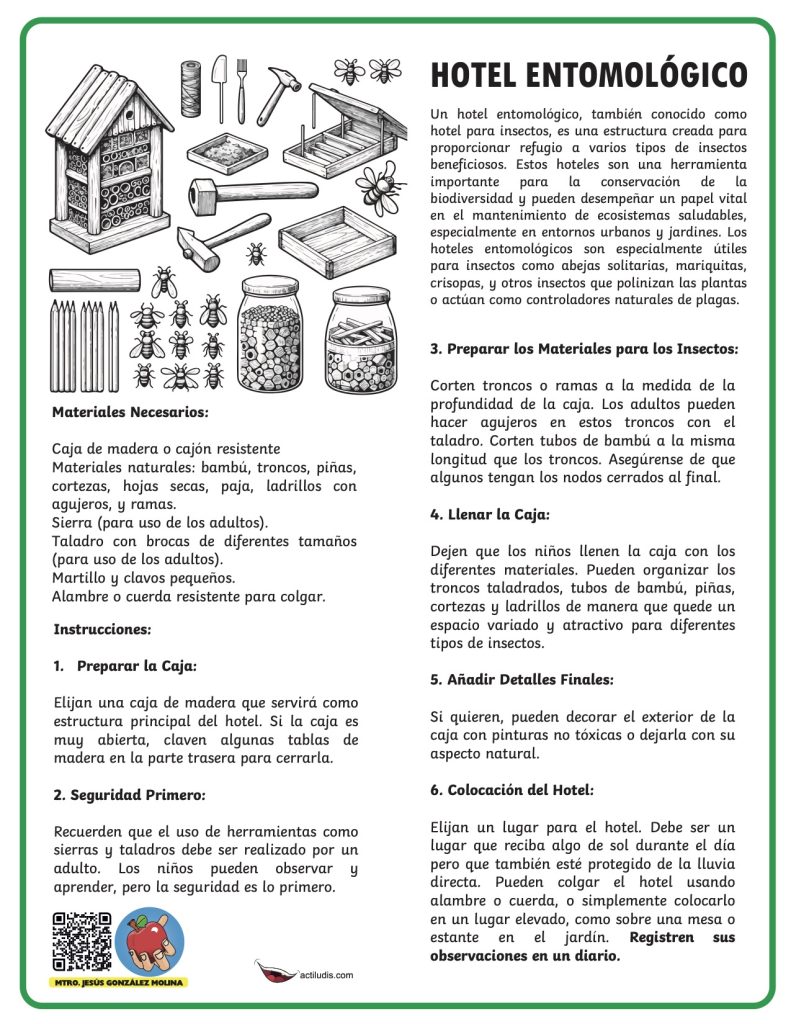 Hotel entomológicoUn hotel entomológico, también conocido como hotel para insectos, es una estructura creada para proporcionar refugio a varios tipos de insectos beneficiosos. Estos hoteles son una herramienta importante para la conservación de la biodiversidad y pueden desempeñar un papel vital en el mantenimiento de ecosistemas saludables, especialmente en entornos urbanos y jardines. Los hoteles entomológicos son especialmente útiles para insectos como abejas solitarias, mariquitas, crisopas, y otros insectos que polinizan las plantas o actúan como controladores naturales de plagas.