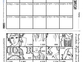 Veinte operaciones de restar con unidades de millar. Puede realizarse dentro de cada celda, mentalmente o usar rejillas ABN para su resolución. Dejamos una plantilla de rejillas para imprimir si el docente lo considera necesario. El puzle está montado a partir de un dibujo de la película musical juvenil «Camp …
