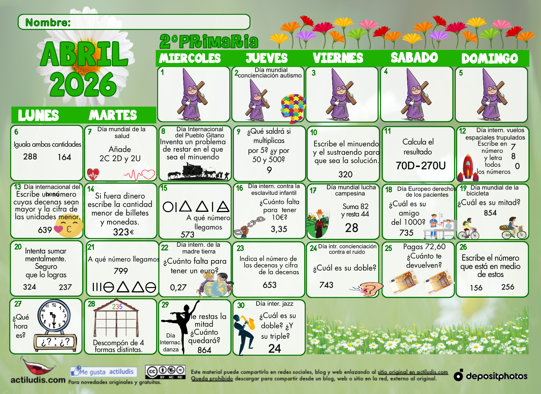 Calendario matemático para el PRIMER CICLO de Primaria. ABRIL 2026