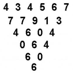 Caso 1: Si el segundo y penúltimo suman un número par, lo haríamos tal cual hemos indicado. Por ejemplo supongamos que tenemos los siguientes números 3 9 2 4 1 4. En este caso la suma del segundo «9» y el penúltimo «1» es 10 un número par. Por tanto el final de la pirámide será 7; la suma del primero «3» y el último «4».