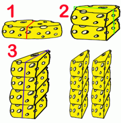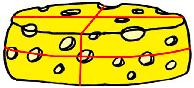 El ratón Pérez ha invitado a 7 amigos a su nueva casa y para festejarlo ha comprado un gran queso que pretente comerse partiendolo en 8 partes iguales, pero además como viene muy cansado del trabajo ha ideado dos formas de cortar esos 8 trozos en sólo tres cortes.