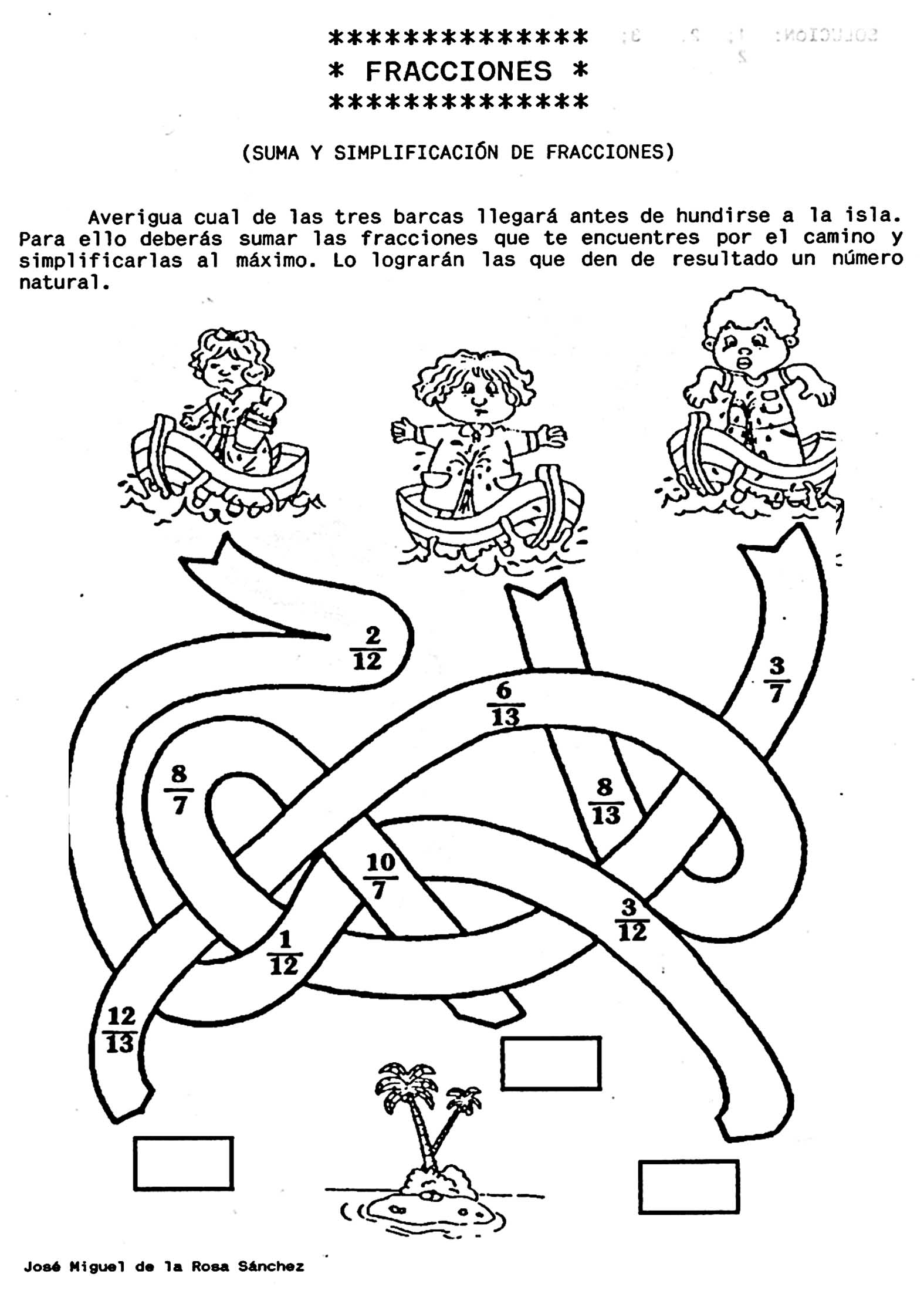 Con esta actividad trabajamos la suma de fracciones con tres términos, para ello he utilizado como elemento motivar un laberinto de tres caminos distintos en los que hay que buscar las fracciones que deben sumarse y una vez realizada la suma realizamos la simplificación de fracciones para comparar y averiguar cuál de los tres llega antes a la isla.