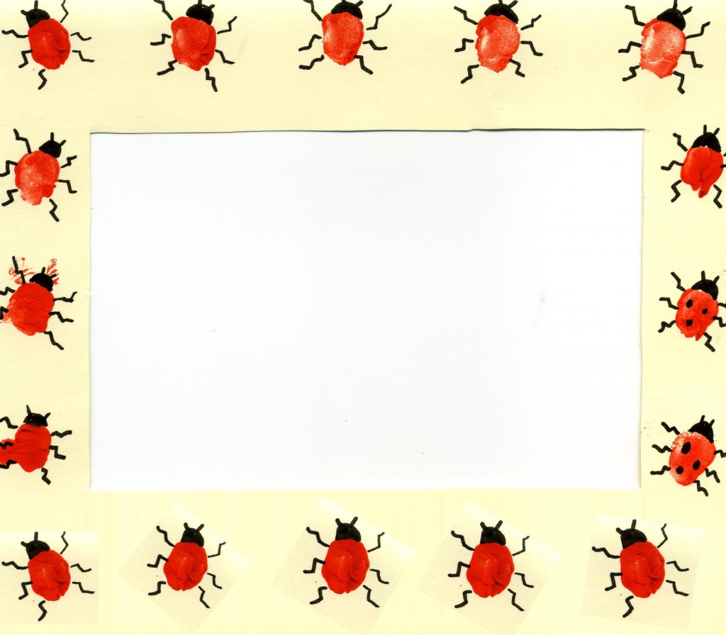Mª Ángeles Mesa nos envía este marco realizado en cartulina. En las imágenes del frontal y revés (clic para ampliar) del marco se puede observar que a partir de las manchas de los dedos mojados en pintura han creado insectos añadiéndole las patas y la cabeza. Necesitas una cartulina tamaño A4, doblarla por la mitad y cortar por donde se indica en los gráficos.