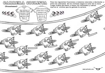 Con esta ficha trabajamos el paso de fracción a número natural y decimal. Las fracciones son todas exactas o con el denominador por 10 o 100. La solución al final del artículo.