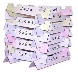 Consiste en una tarjetitas de cartulina que por un lado tiene una multiplicación sin el resultado y por la otra con el resultado. Se puede jugar en parejas o individualmente. El juego consiste en ir preguntando o enseñando el lado que no tiene la respuesta, si la aciertas las vas amontonando aprovechando una