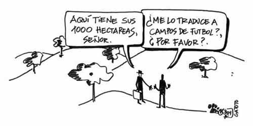 Hace unos días publiqué un artículo sobre el sistema métrico «campofutbolero» que curiosamente utilizan los medios de comunicación, pues en relación a éste artículo os dejo este chiste gráfico que he encontrado en la magnífica web de Pablo Flores Martínez de la Universidad de Granada.