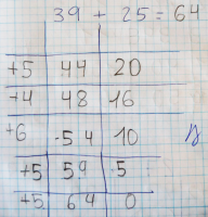 2.- Igualmente el orden de realización de los cálculos es indiferente: se puede empezar por decenas, continuar por unidades y acabar por centenas o indistintamente. De esta forma se termina con otro problema que tienen los alumnos al iniciarse en la sumas con llevadas en el algoritmo tradicional. Muchos empiezan por la derecha al igual que hacen a la hora de leer, con lo cual dan al traste con toda la suma.