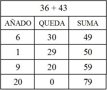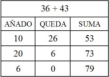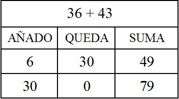 Partamos de una suma simple, de las que en el artículo sobre la secuenciación en la introducción de la suma se indica usar este algoritmo. Por ejemplo “decenas incompletas más decenas incompletas” 36 + 43