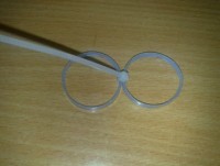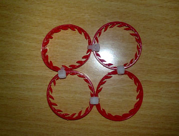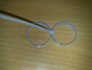 Materiales: anillas de plástico, bridas de plástico (las más pequeñas) las hay de colores aunque nosotros usamos las blancas, tijeras y tela por si quieres forrarlo por dentro.