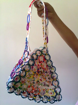 Se trata de una manualidad realizada con las anillas que quedan bajo el tapón de las botellas de plástico. Con ellas hemos realizado bolsos de playa y recipientes tipo recogetodo. Para realizarla necesitarás una gran cantidad de anillas, por lo que debes avisar con tiempo a los alumnos/as para que las recolecten.