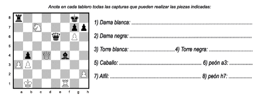 Recorrido de las piezas en 1, 2 y más jugadas; límites al movimiento de las piezas; captura de piezas; la captura del peón al paso; piezas defendidas y colgadas; breve historia del ajedrez.