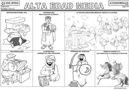 Junto a esta última entrega que consta de 4 fichas con los hechos más relevantes del periodo de la edad media, se incluye una portada por si en lugar de ponerlas una a continuación de la otra a modo de «friso» histórico, queréis un cuadernillo con todas las fichas.